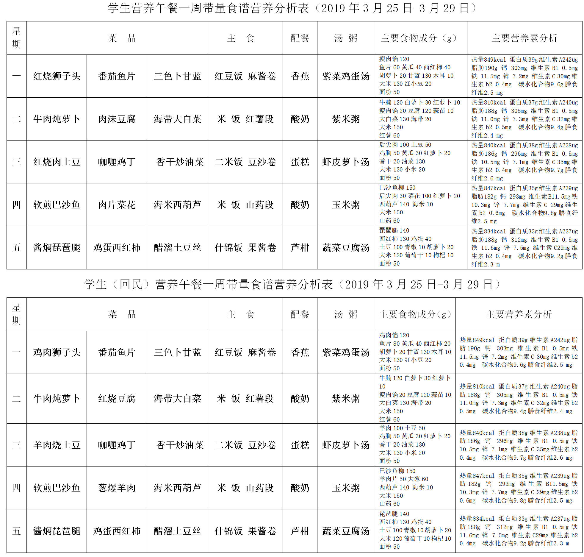 学生食谱0325--0329